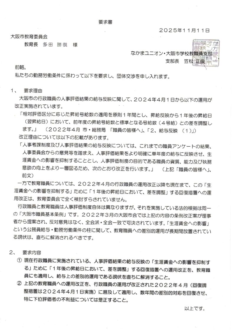 11月11日、なかまユニオン大阪市学校教職員支部は、大阪市教育委員会に対して、以下2点の要求書を提出し、団体交渉を求めました。