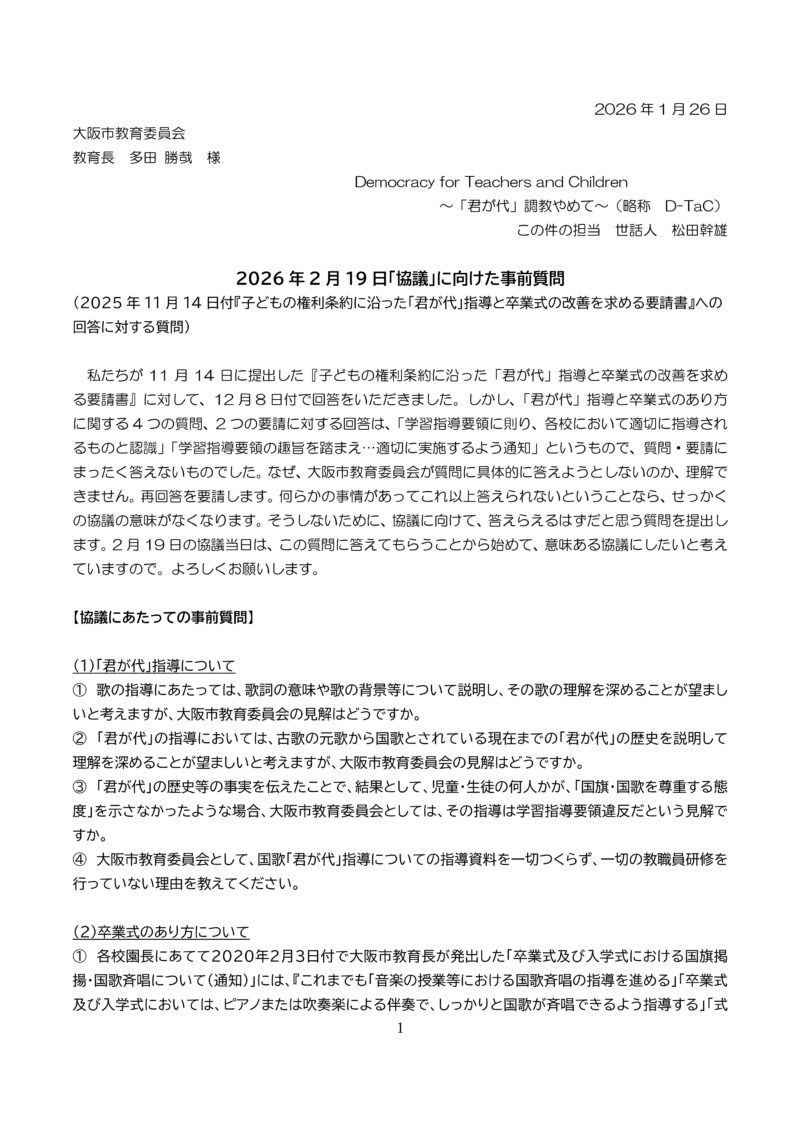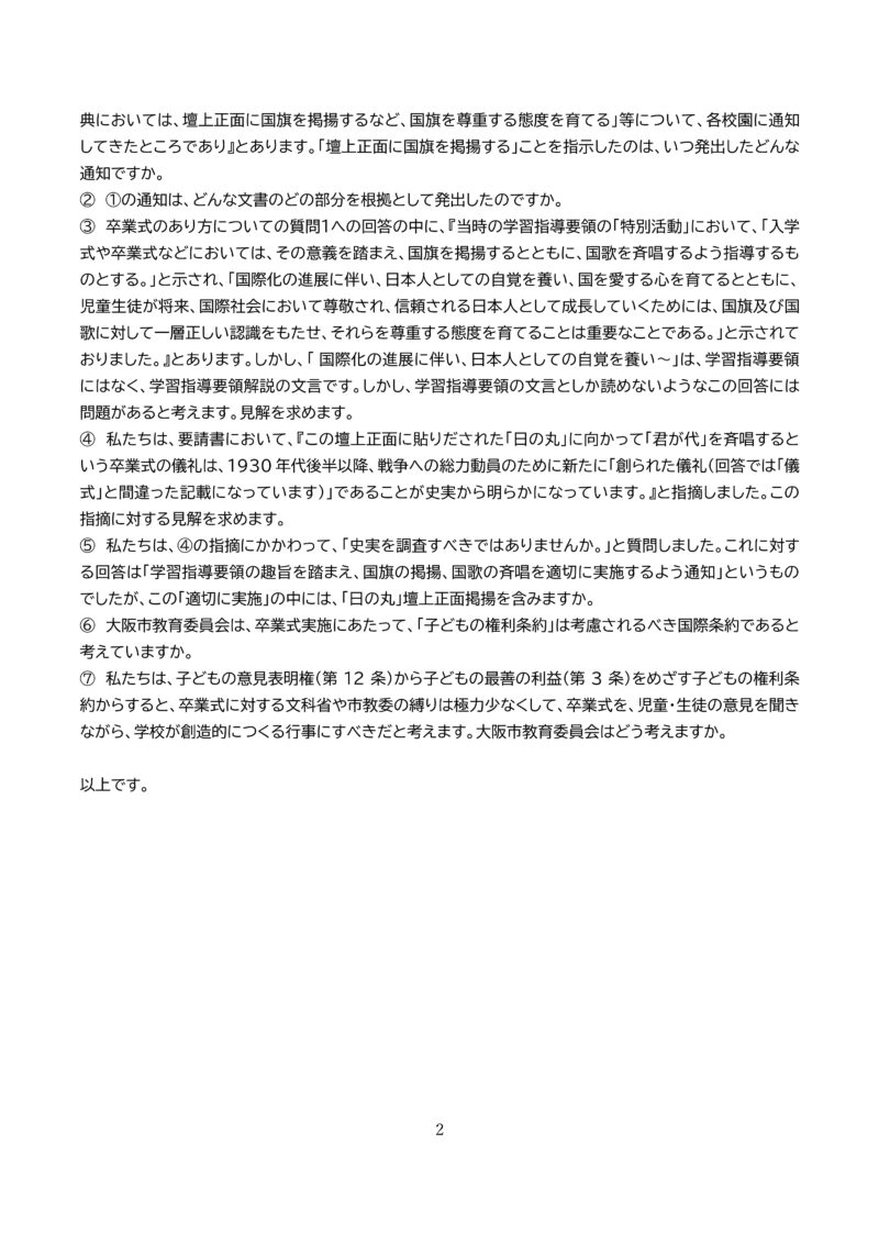 私たちが11月14日に提出した『子どもの権利条約に沿った「君が代」指導と卒業式の改善を求める要請書』に対して、12月8日付で回答をいただきました。しかし、「君が代」指導と卒業式のあり方に関する4つの質問、2つの要請に対する回答は、「学習指導要領に則り、各校において適切に指導されるものと認識」「学習指導要領の趣旨を踏まえ…適切に実施するよう通知」というもので、質問・要請にまったく答えないものでした。なぜ、大阪市教育委員会が質問に具体的に答えようとしないのか、理解できません。再回答を要請します。何らかの事情があってこれ以上答えられないということなら、せっかくの協議の意味がなくなります。そうしないために、協議に向けて、答えらえるはずだと思う質問を提出します。2月19日の協議当日は、この質問に答えてもらうことから始めて、意味ある協議にしたいと考えていますので。よろしくお願いします。