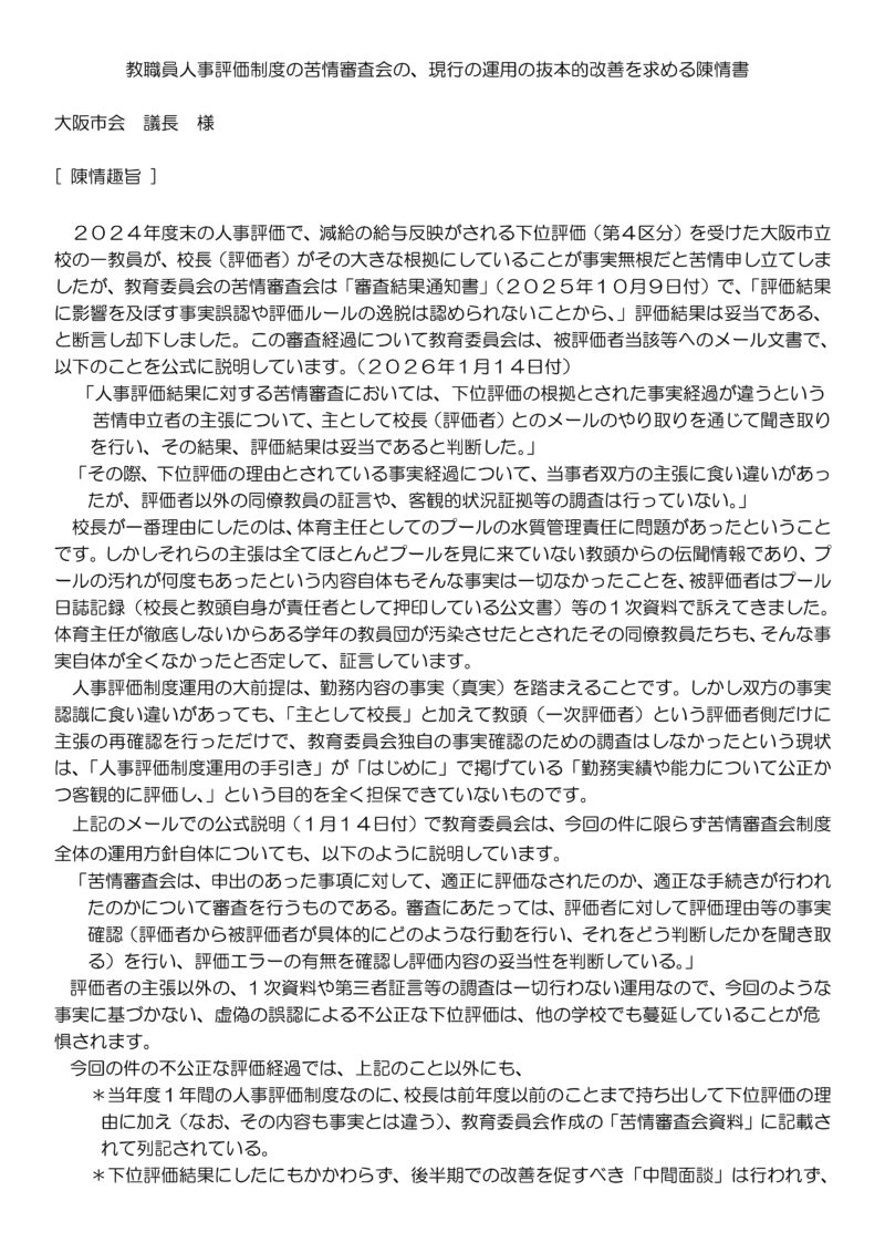 教職員人事評価制度の苦情審査会の、現行の運用の抜本的改善を求める陳情書