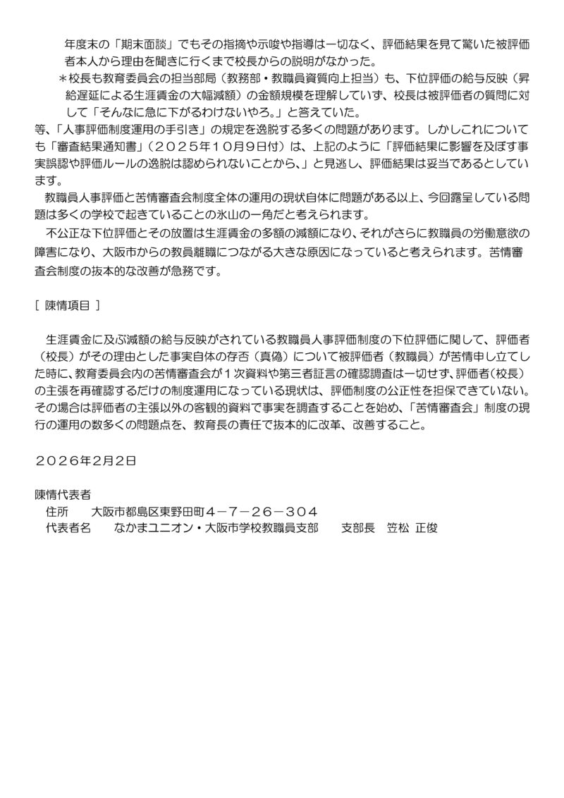 不公正な下位評価とその放置は生涯賃金の多額の減額になり、それがさらに教職員の労働意欲の障害になり、大阪市からの教員離職につながる大きな原因になっていると考えられます。苦情審査会制度の抜本的な改善が急務です。