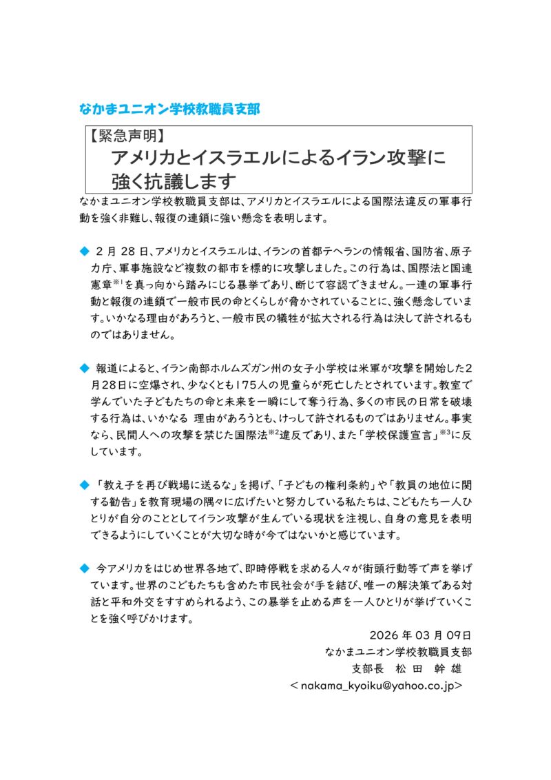 なかまユニオン学校教職員支部は、アメリカとイスラエルによる国際法違反の軍事行動を強く非難し、報復の連鎖に強い懸念を表明します。