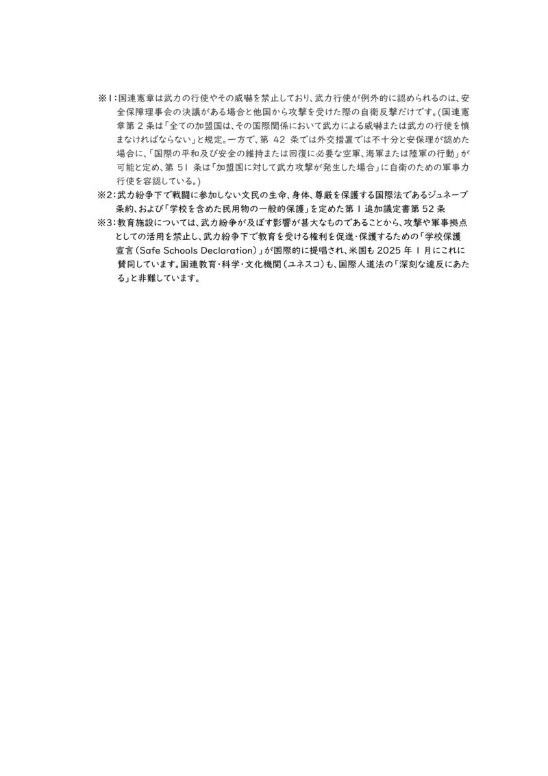 ※2:武力紛争下で戦闘に参加しない文民の生命、身体、尊厳を保護する国際法であるジュネーブ条約、および「学校を含めた民用物の一般的保護」を定めた第1追加議定書第52条